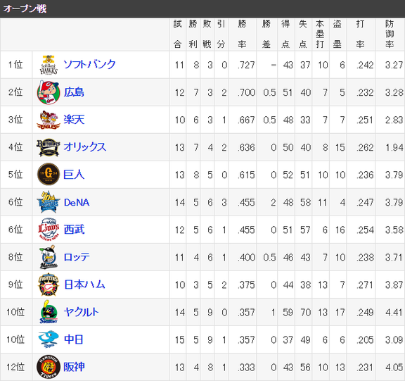 【オープン戦 チーム防御率】