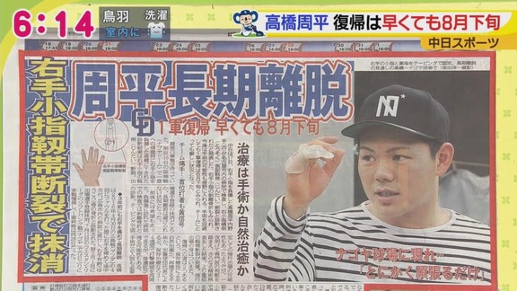 復帰への道は2つあるという。保存療法による自然治癒か、再建する手術か。加藤球団代表によると、保存治療なら3~4週間で打撃練習を再開できるが、後遺症が残る可能性もある。手術だと入院も必要なため、打撃練習再開まで4~5週間ほどかかる。